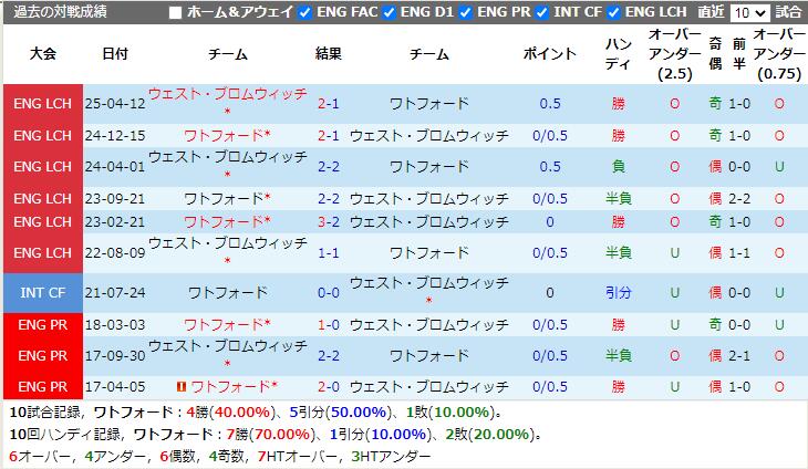 ワトフォードFCの守備陣は相手の攻撃を効果的に抑え込むのに苦戦する可能性があり、ウェスト・ブロムウィッチはその勢いに乗って連勝を続ける可能性が高いことを考えると、ウェスト・ブロムウィッチはアウェーでの勝利を確保し、連勝を達成する。