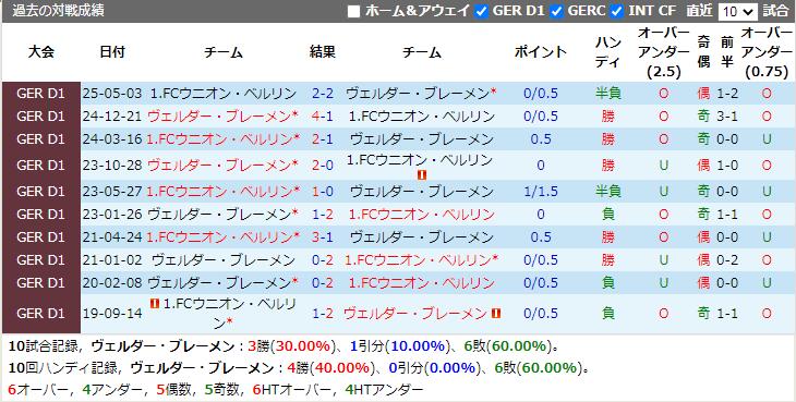 両チームの最近の成績を見ると、ヴェルダー・ブレーメンは直近2試合無敗、1. FCウニオン・ベルリンは直近4試合中3試合無敗です。