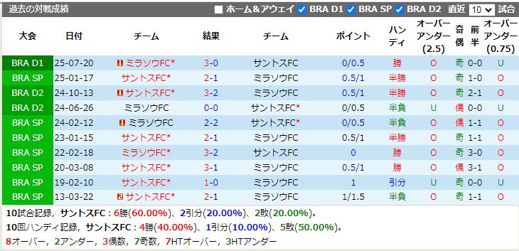 ミラソウFCは最近守備が改善し、攻撃力も安定しているが、全体的には、ホームでの応援と歴史的な優位性という2つの利点を持つサントスFCがこの試合で勝利を収める可能性が高い。