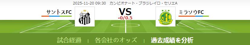 サントスFCは直近5試合で8失点と不安定な状況が続いている一方、ミラソウFCのアウェイでのパフォーマンスは平凡で、15試合で2勝3分10敗と、明らかに心理的に不利な状況にある。