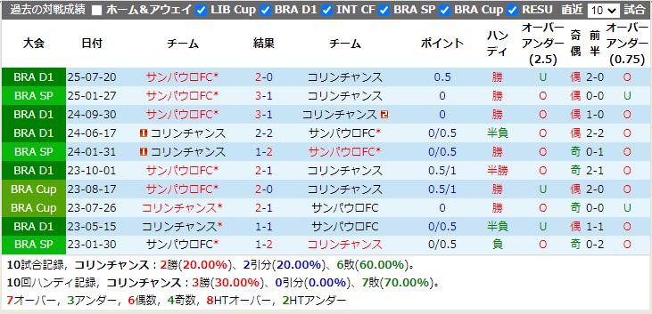 対戦成績を見ると、サンパウロFCはコリンチャンスとの直近7試合で6勝1分けと無敗を維持しており、サンパウロFCが優位に立っています。これには今シーズンのリーグ戦第1戦も含まれており、サンパウロFCはホームで2-0で勝利しています。
