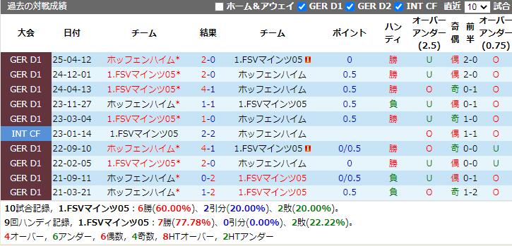 1.FSVマインツ05 VS ホッフェンハイム 試合予想