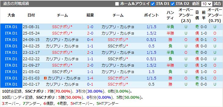 SSCナポリは現在3連勝中ですが、カリアリ・カルチョは全大会を通して過去9試合で1勝も挙げられていません。