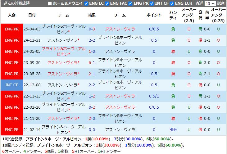 ブライトン&ホーヴ・アルビオンFCとアストン・ヴィラFCは現在、それぞれ5位と4位に位置しており、両者の勝ち点差はわずか2ポイントです。