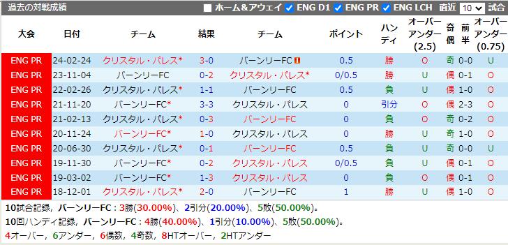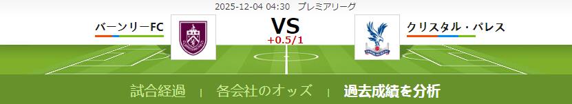 両チームの最近の成績を見ると、バーンリーFCは4連敗中、クリスタル・パレスFCは2連敗中だ。