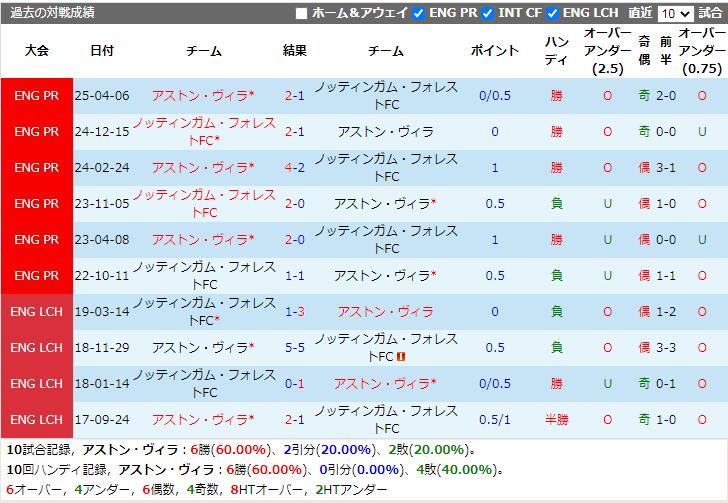 最近の成績を比較すると、アストン・ヴィラは直近10試合中9勝を挙げている。一方、ノッティンガム・フォレストは現在3連敗中だ。