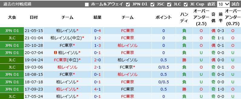 Fc 東京はカップ戦で札幌に逆転勝利を収め、士気が高まった。FC東京がリーグ戦で2連勝を飾り、士気も高い。一方、柏レイソルは前節ホームで fc 横浜を2-1で下して2連勝を収め、調子が良くなった。しかし、今節-0.25というハンディをつけ、ブックメーカーはFC東京に信頼を寄せている。FC東京は過去両チームの5対戦で4勝を収め、優勢に立った。今節FC東京が期待できる。